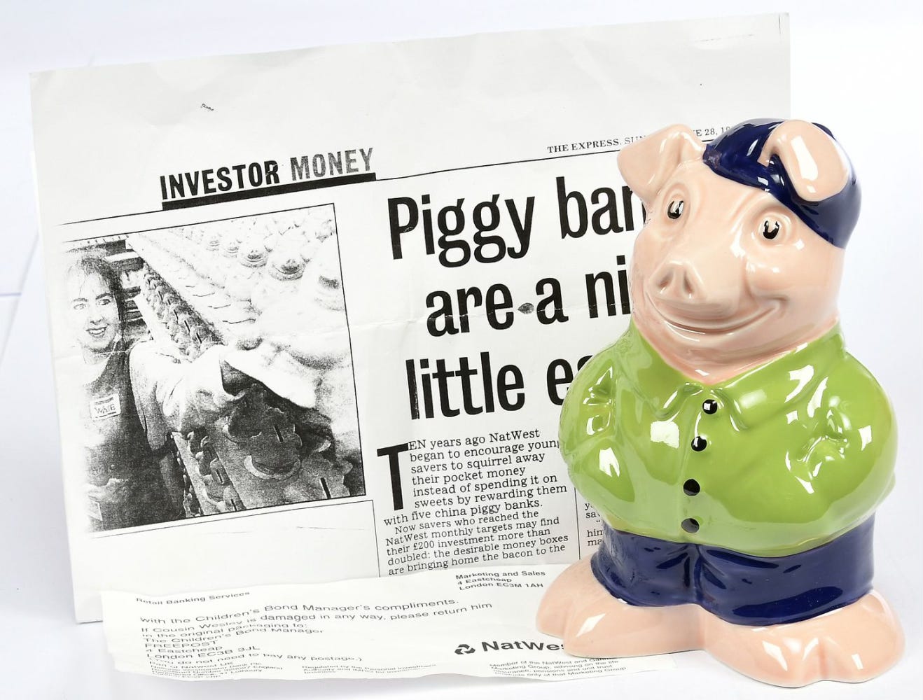 This collection of five* piggy banks launched a little before my time on the 5th December 1983 (I was born in '87). Produced by Wade Ceramics, they were commissioned to incentivise kids (and presumably, their parents) to set up a NatWest savings account, which was, at the time, one of the first aimed solely at children.